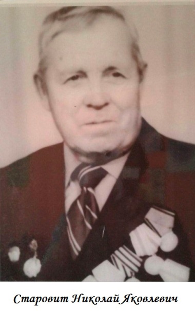 Николай Яковлевич родился 06.01.1908 г. в селе Невское Лесозаводского района. Свою трудовую биографию начал в колхозе разнорабочим, потом бригадиром полеводческой бригады. Осенью 1932 г. пошел на курсы трактористов. Так за рулем и застала его Великая Отечественная война. Окончив краткосрочные курсы младших командиров, Николай Яковлевич с группой товарищей был отправлен на фронт. С боями пройдя почти всю Украину, отряд приблизился к Шепетовке, где родился Николай Островский. Разгорелись сильные бои. В жестокой схватке Николай Яковлевич был тяжело ранен. Вот как это произошло, по его словам. Туманным вечером на железнодорожном полотне в направлении Винницы орудийный расчет Николая Яковлевича занял позицию у небольшой возвышенности. В полутора километрах от города укрепились немцы. Когда бойцы начали окапываться, противник открыл огонь, ранив четырех бойцов из расчета. В наступление пошли немецкие танки, прижав бойцов к земле. Наблюдая за противником, Николай Яковлевич увидел, что в 250-ти метрах движутся на них черные коробки. Эти немецкие танки были брошены для того, чтобы освободить окруженную в Шепетовке немецкую группировку. Наши бойцы сделали несколько выстрелов: один танк задымился, остальные уползли в ночь. На рассвете второго дня началось наступление. Танки опять поползли на наши позиции. Выждав, пока танки подойдут поближе, бойцы прицелились и открыли огонь. Один из танков с качающейся антенной, видимо, командирский, выплеснул сноп огня. У Николая Яковлевича зашумело в голове, перед глазами поплыли оранжевые круги. Придя в себя, Николай Яковлевич увидел: снова атака, снова танки. А наша пехота, вернее то, что от нее осталось, отступает под натиском фашистских танков. Стоял грохот выстрелов, лязг вылетающих гильз, заполнивших пространство вокруг орудия. Недолго думая, Николай Яковлевич выпустил еще сорок снарядов. Последнее, что он отчетливо запомнил, яркое пламя взрывов. Раненый, теряя сознание, он полз к своим, пока его не подобрали санитары. Затем были белые и тихие госпитали Киева, Харькова, а затем санаторий Ессентуки. После лечения – снова фронт: Николай Яковлевич воевал под Кенигсбергом, а затем с империалистической Японией на Дальнем Востоке. В ноябре 1945 года Старовит Николай Яковлевич вернулся домой в свое родное село Невское, где трудился бригадиром овощеводов. После ухода на пенсию Николай Яковлевич не сидел сложа руки: летом принимал участие в переработке зерна в совхозе, держал собственную пасеку, а каждую зиму трудился в собственной столярной мастерской, где изготовлял сани, которые в то время пользовались большим спросом у сельчан. Николай Яковлевич был награжден: Орденом Отечественной войны, медалью за отвагу, медалью за боевые заслуги, медалью за победу над Германией, медалью за победу над Японией.